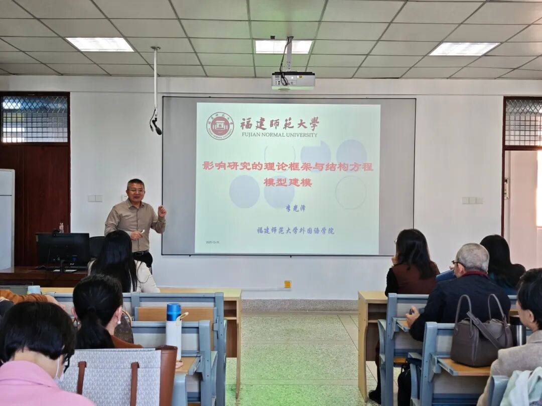 李光泽副教授,围绕“影响研究的理论框架与结构方程模型建模”展开专题分享,语言学与翻译学方向的教师聆听了本场讲座。