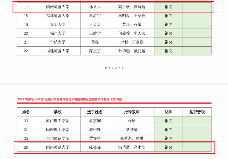 近日,由福建省教育厅主办,福建师范大学和福建医科大学承办,外语教学与研究出版社协办,福建省外国语文学会、福建省大学外语教学研究会作学术指导的2024年度的“理解当代中国”全国大学生外语能力大赛福建赛区英语赛道选拔赛顺利举行。本次大赛紧扣“理解中国,沟通世界”的主题,共设国际传播综合能力、笔译、演讲、口译及短视频等赛项,吸引了福建省内高校的众多杰出学子踊跃参与。我院学子表现优异,张曦月和陈艺畅同学分别获得国际传播综合能力赛项金奖和银奖,陈艺畅和李林炜分别获得演讲赛项金奖和银奖,以上同学均已晋级国际传播综合能力国赛。此外,陈艺畅和孙虹分获笔译赛项银奖和铜奖,林义丰和陈嘉瑶均获得口译赛项铜奖。