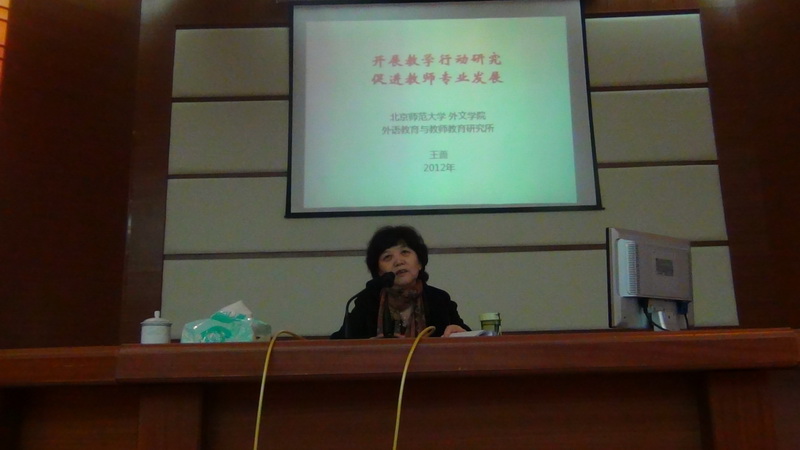外语系进行学术交流。王蔷教授于当天在旧图书馆报告厅开设了三场学术讲座,围绕着“开展教学行动研究,促进教师专业发展”这一话题展开了深入精彩的讲解。来自全省各中学的30名英语学科带头人、外语系部分教师及研究生参加了此次讲座,讲座由外语系副主任吴玉玲教授主持。
