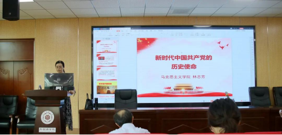 党委书记吴晓峰同志主持,校党史宣讲团成员、马克思主义学院林志芳副教授主讲,学院党委理论中心组成员、全体教工党员和部分学生党员参加。