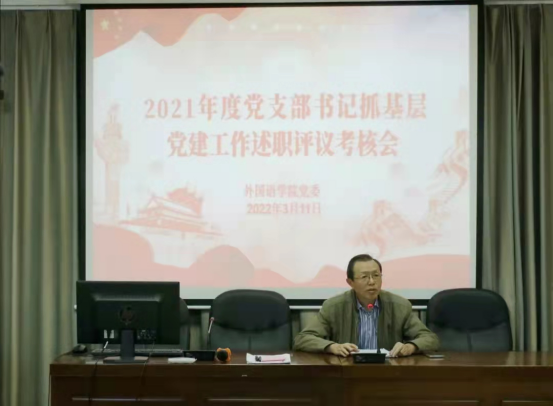在综中504召开2021年度党支部书记抓基层党建工作述职评议考核会议,学院党委委员、各党支部书记以及支委代表参会,会议由学院党委书记吴晓峰主持。