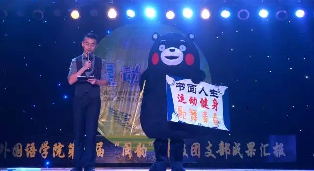 15日语1班团支部围绕“趣艺汇通”主题分为“书法组”、“运动健身组”以及“歌舞组”进行建设。“小搭档”熊本熊更是晚会当之无愧的“熊一号”!