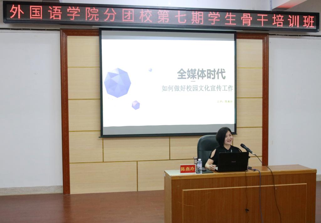 10月25日晚7点,外国语学校第七期分团校学生骨干培训班第五讲“校园新闻与写作”在逸夫楼梯二教室开讲。校新媒体中心陈燕玲老师为学生干部授课。