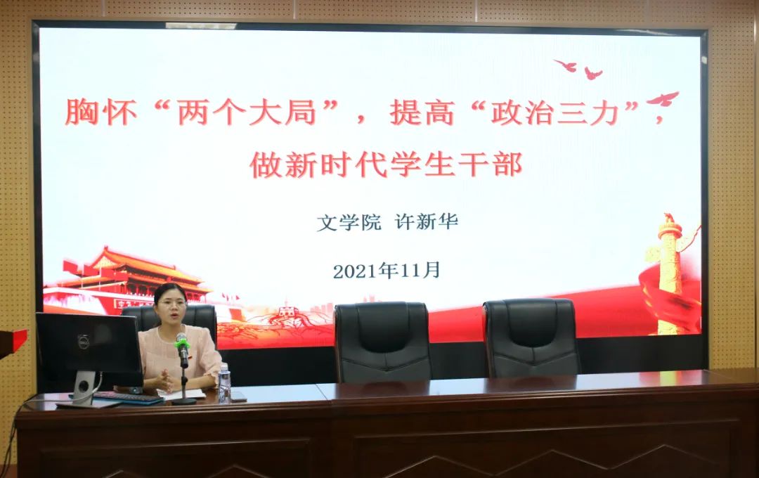 许新华老师从“胸怀‘两个大局’”、“认识‘政治三力’”、“提高‘政治三力’”三个方面回答了为什么要做新时代干部、做什么样的新时代干部、怎样做好新时代学生干部的问题。许老师以“两个大局”为切入点,深析当今时代最为鲜明的时代特色——世界百年未有之大变局、中华民族伟大复兴战略全局,引出了认识“政治三力”的必要性并阐释“政治三力”的基本内涵。最后,她指出学生干部要不断提高政治判断力、政治领悟力、政治执行力,正确认识世界和中国发展大势、正确认识时代责任和历史使命、正确认识远大抱负和脚踏实地,成长为德才兼备、全面发展的新时代学生干部。