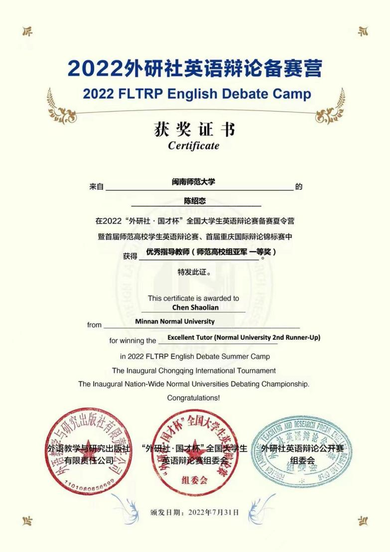 陈绍恋老师具有丰富的专业知识与经验,在2022外研社英语辩论赛中担任指导教师,细心指导我院学子备赛,荣获“优秀指导教师”称号!