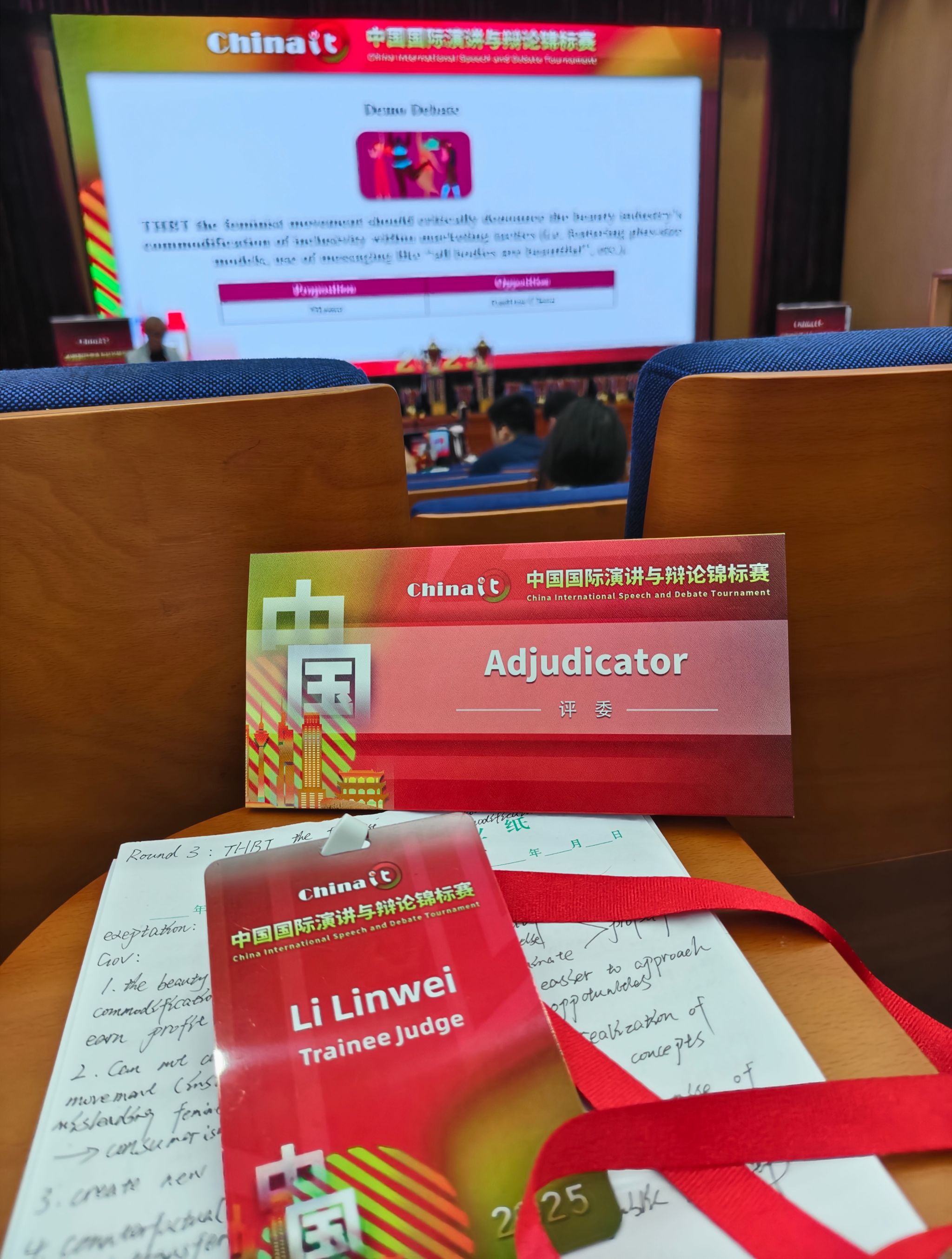 从在赛场中拼搏的优秀选手,到在评审席上专注的实习裁判,角色的转变不仅是身份的切换,更体现了他在英语辩论领域的持续成长——从对辩论技巧的掌握,到对赛事规则、评判逻辑的深入理解,综合素养得到了全面提升。对于本次评审经历,李林炜表示“通过本次学习评审经历,让我对辩论的评判标准有了更清晰的认知,也学会了从更专业的角度去拆解一场辩论。这些实实在在的收获,对我自己的辩论认知和逻辑梳理能力,都是一次挺重要的提升。”
