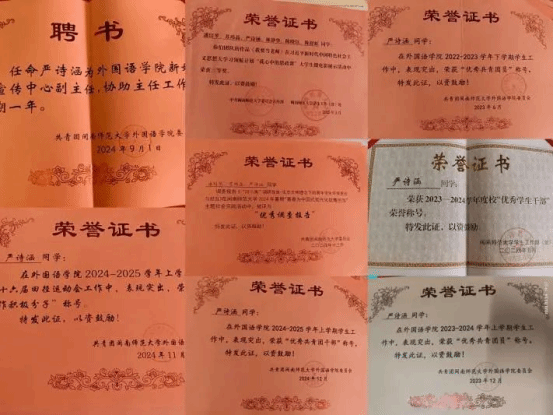 艺术团副团长、24级代理班主任。在思想上,她始终以党员的标准要求自己,不断提高自身党性修养。在学生工作上,她努力做好老师和同学沟通的桥梁,曾被评为校“优秀共青团干部”,院“优秀学生干部”。在学习上,她刻苦钻研,曾获得校专业二等奖学金,校“三好生标兵”等荣誉。她积极参加学科竞赛,获得2024年“国才杯”“理解当代中国”全国大学生外语能力演讲大赛校银奖,2024年“国才杯”“理解当代中国”短视频大赛校金奖、2024年全国大学生英语翻译大赛省金奖,第五届“英语讲故事大赛”校金奖,2024年21世纪演讲比赛省铜奖。此外,她还积极参加实践活动,在2024-2025学年寒假“追寻领袖足迹 体悟优秀传统文化”主题社会实践活动中获得“优秀个人”称号。