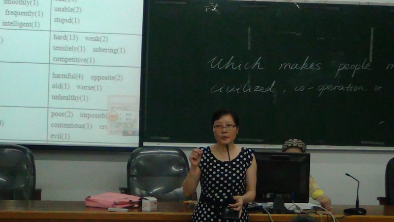 英语专业大四103份作文来进行质性研究,其中包括:介入资源、情感词汇及非情感词汇的分析。该研究还提出几点教学启示和建议,如老师要教会学生围绕关键性的词汇写作;学生应进行词汇训练、句法训练、篇章训练等,同时,她还针对论文写作中可能遇到的问题给在场的同学们提供了许多值得借鉴的经验。