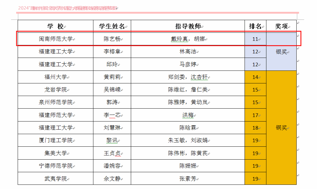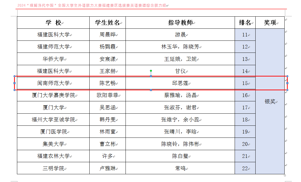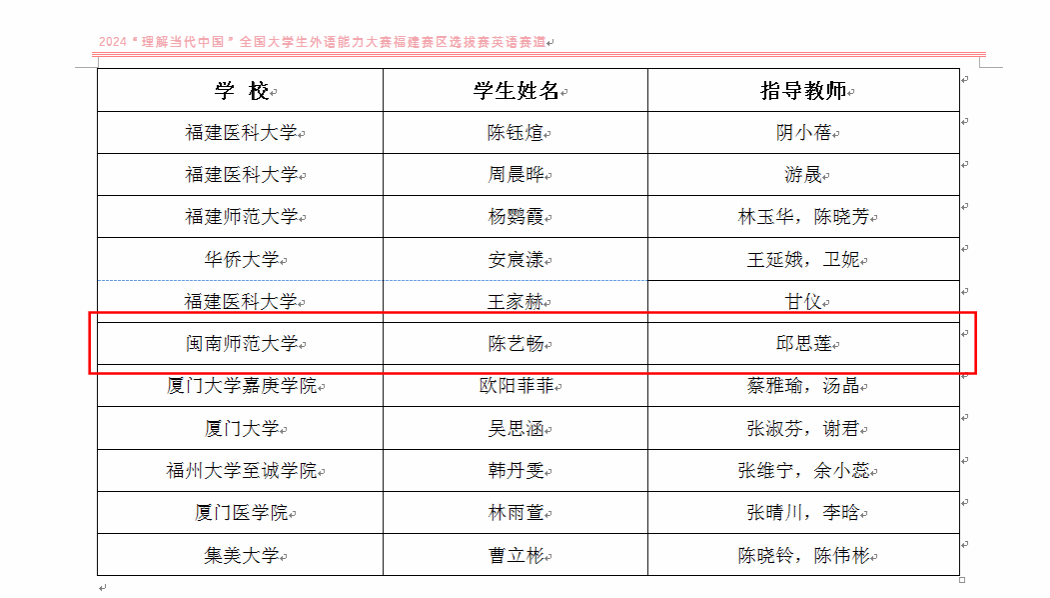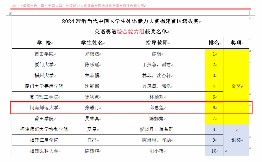 近日,由福建省教育厅主办,福建师范大学和福建医科大学承办,外语教学与研究出版社协办,福建省外国语文学会、福建省大学外语教学研究会作学术指导的2024年度的“理解当代中国”全国大学生外语能力大赛福建赛区英语赛道选拔赛顺利举行。本次大赛紧扣“理解中国,沟通世界”的主题,共设国际传播综合能力、笔译、演讲、口译及短视频等赛项,吸引了福建省内高校的众多杰出学子踊跃参与。我院学子表现优异,张曦月和陈艺畅同学分别获得国际传播综合能力赛项金奖和银奖,陈艺畅和李林炜分别获得演讲赛项金奖和银奖,以上同学均已晋级国际传播综合能力国赛。此外,陈艺畅和孙虹分获笔译赛项银奖和铜奖,林义丰和陈嘉瑶均获得口译赛项铜奖。