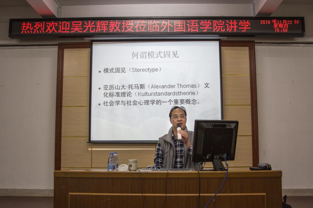 11月22日下午3点,厦门大学外文学院副院长、博导吴光辉教授莅临我院作关于“模式固见与日本认识”的讲座,讲座由日语系主任庄苹副教授主持,日语系师生参加了讲座。