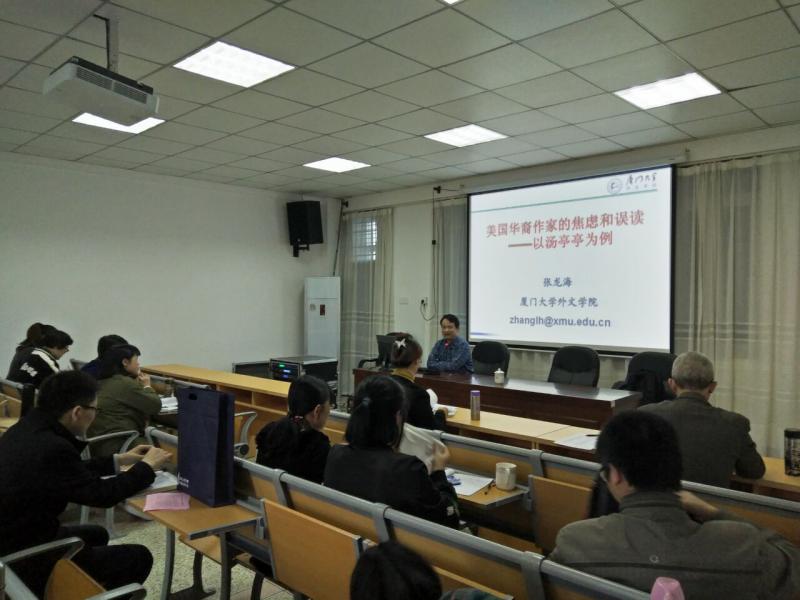 讲学。讲座由刘熠博士主持,外语学院教师(文学专业方面的居多)和部分学生参加。张教授的讲座题为“美国华裔作家的焦虑和误读——以汤亭亭为例”,他以赵健秀与汤亭亭为主的两大阵营的文化论战为引子,运用哈罗德·布鲁姆的诗学影响理论,分析了美国华裔作家汤亭亭«女勇士»的创造性误读。张教授认为,《女勇士》的创造性误读表现在以下两个方面:第一,从文体上看,《女勇士》既是传记又非传记,既是虚构又非虚构,这是对美国华裔文学之母黄玉雪传记《华女阿五》文体上的创造性超越;第二,从内容上看,汤亭亭借用岳母刺字、闯王李自成、贤妻良母等中国传统文化,在《女勇士》中建构了她的美国华裔花木兰,从而把对《木兰辞》的创造性误读发挥得淋漓尽致。