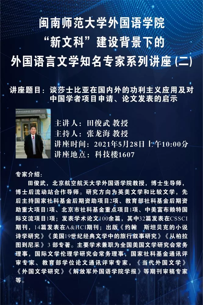 讲座题目:谈莎士比亚在国内外的功利主义应用及对中国学者项目申请、论文发表的启示