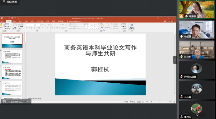 此外,郭桂杭教授还结合广东外语外贸大学国际商务英语学院的做法,分享了自身指导商务英语专业本科生开展研究和发表论文的经验,以促进专业老师们实现师生共研,并解答了与会教师指导商务英语专业学生撰写毕业论文的过程中遇到的困惑。