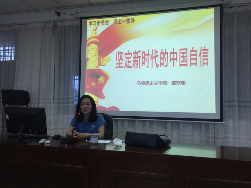 覃轶珊副教授以“坚定新时代的中国自信”为题,从“进入新时代的中国是否应该自信”、“新时代中国自信的源泉在哪里”、“新时代的中国自信将给世界带来什么”三个方面,给全体与会人员进行了生动阐述。黄伟东书记在总结讲话中指出,学习贯彻习近平总书记在北京大学师生座谈会和纪念马克思诞辰200周年大会上的重要讲话精神,是我院当前和今后一段时期的重要政治任务。他高度肯定了覃轶珊教授的授课有高度、有深度、有温度又接地气,对我院全体师生学习贯彻落实习近平总书记重要讲话精神提供了深刻启示。