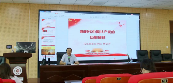 党委书记吴晓峰同志主持,校党史宣讲团成员、马克思主义学院林志芳副教授主讲,学院党委理论中心组成员、全体教工党员和部分学生党员参加。