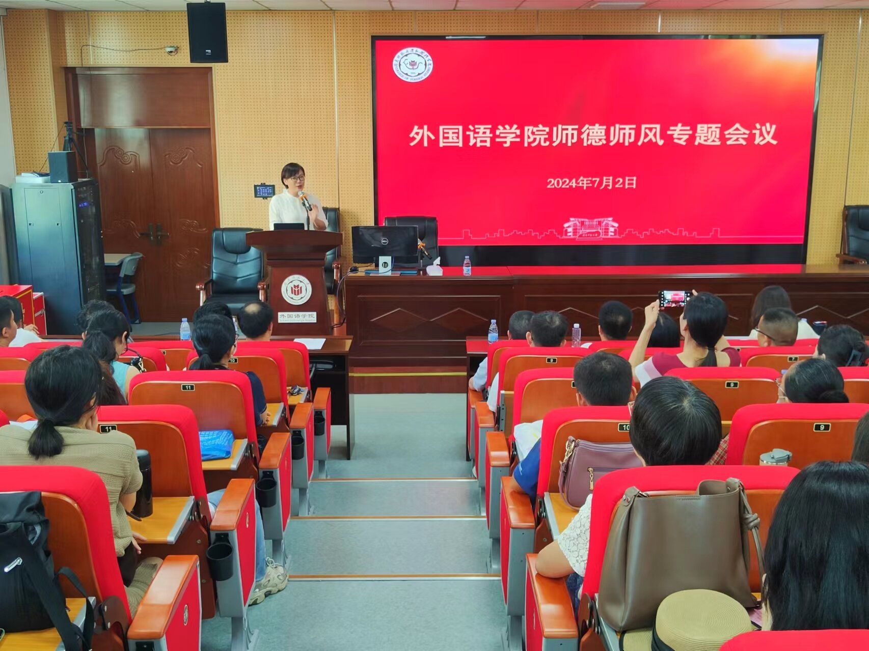 在逸夫楼梯教二召开师德师风专题会议,全体教职工参加会议,会议由学院党委书记陈慧燕主持。