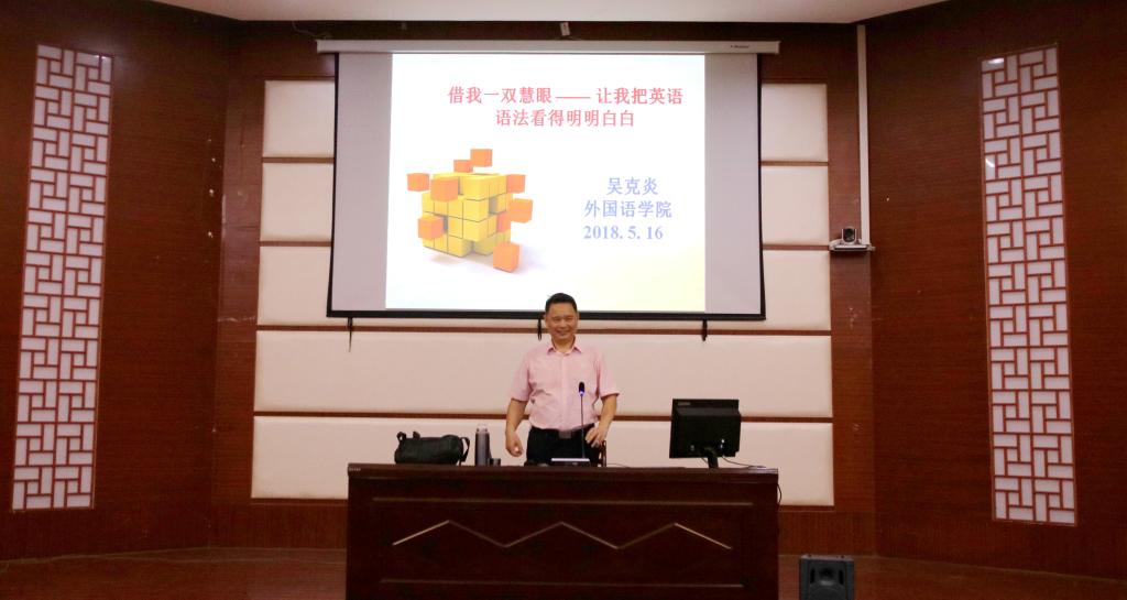 5月16日晚7点半,我院吴克炎教授以“借我一双慧眼,让我把英语语法看得明明白白”为题在东区报告厅开展讲座。我院部分本科生和研究生前来聆听。