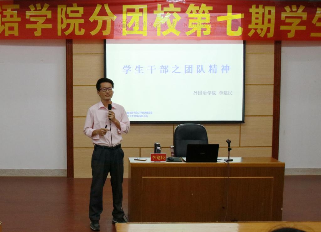 分团校第七期学生骨干培训班第二讲“学生干部之团队精神”在逸夫楼梯教二开讲,辅导员李建民老师为我院主要学生干部授课。