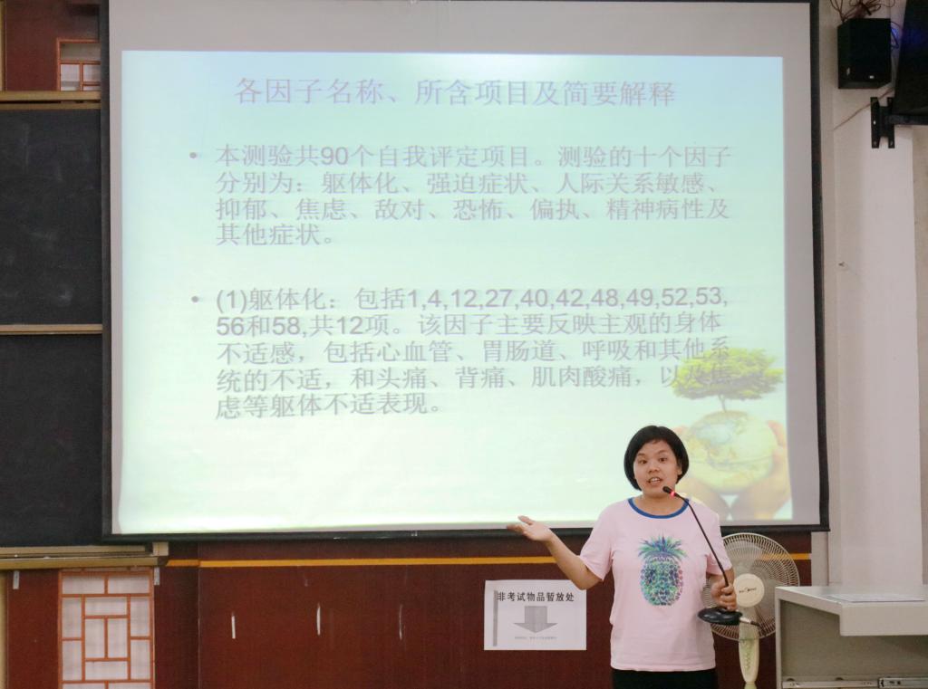 首先,郭梅华老师为新生们播放了全国精神卫生宣传片,从而让新生们对“健康心理,快乐人生”的心理教育主题有了更深入的了解。 接着,她介绍了大学生心理测查情况、症状自评量表(SCL-90)评测标准及评定项目的各因子名称,并以“身体问题与心理问题的关系”为例做了详细讲解。