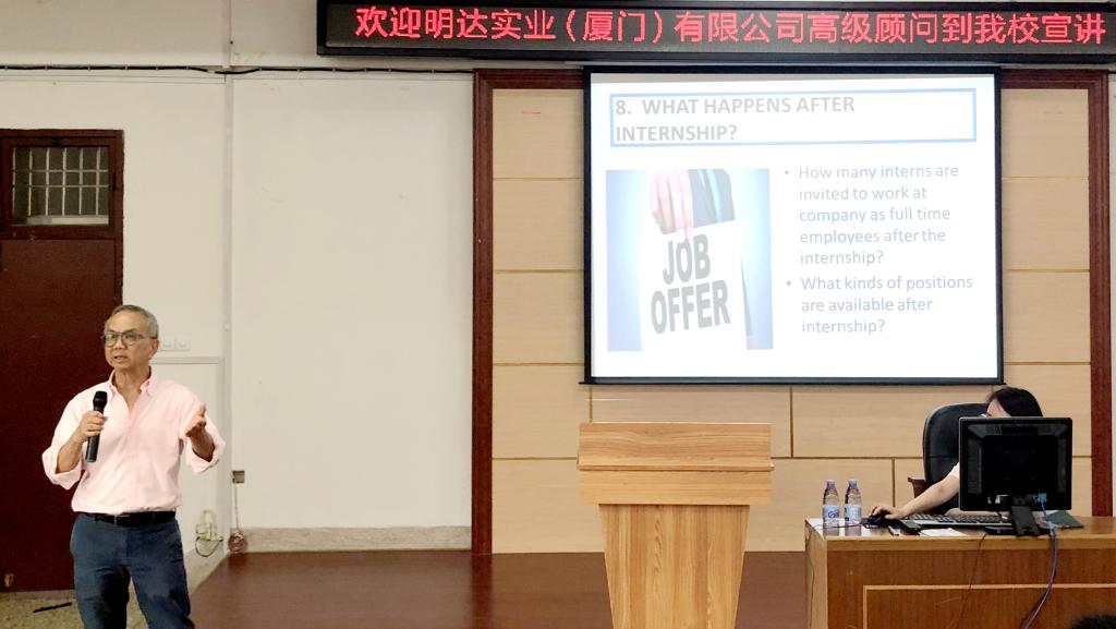 4月11日下午两点,厦门明达实业有限公司高级顾问George Wong在逸夫楼梯教二开展了“Internship”主题讲座。我院17级辅导员梁燕辉老师和17级部分商务英语及翻译专业学生前来聆听。