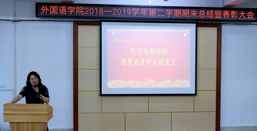 2018-2019学年期末总结暨表彰大会于逸夫楼梯二教室顺利举行。院党委副书记陈慧燕,辅导员梁燕辉、张啸啸、李建民以及我院学生干部代表参加了此次表彰大会。本次大会由李建民老师主持。