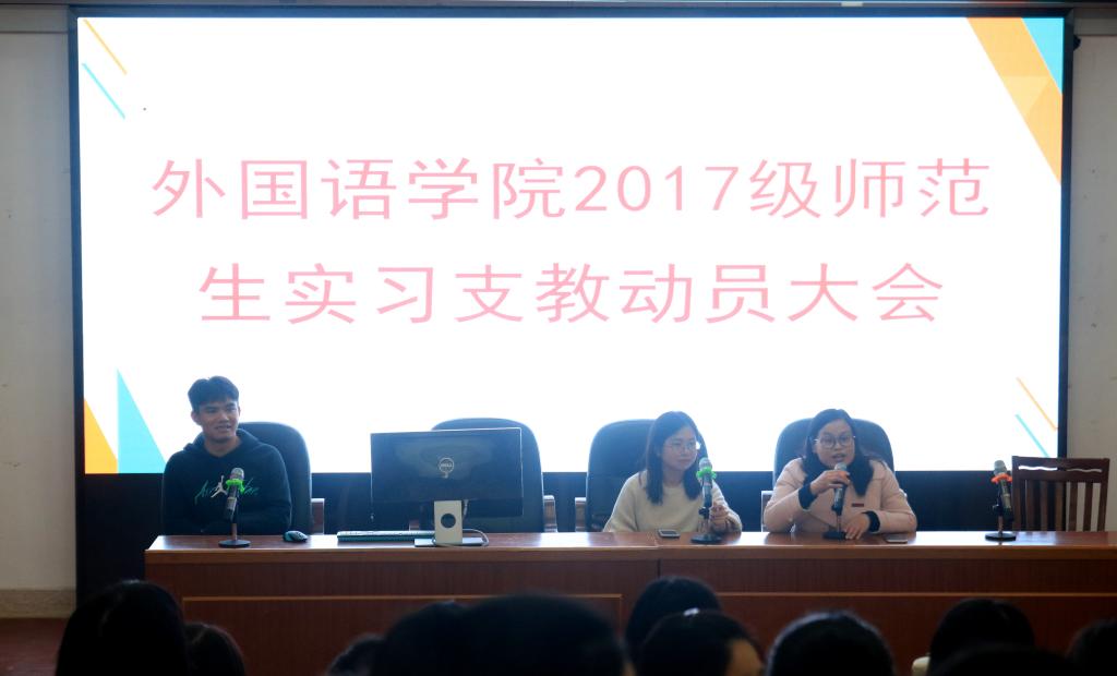 12月25日下午,我院于逸夫楼梯教二开展了2017级英语师范生实习支教动员大会。参会人员有英语系主任陈彩虹老师,实习负责老师李祯老师,辅导员梁燕辉老师以及17级英语(师范)全体三下实习学生。本次大会由李祯老师主持。