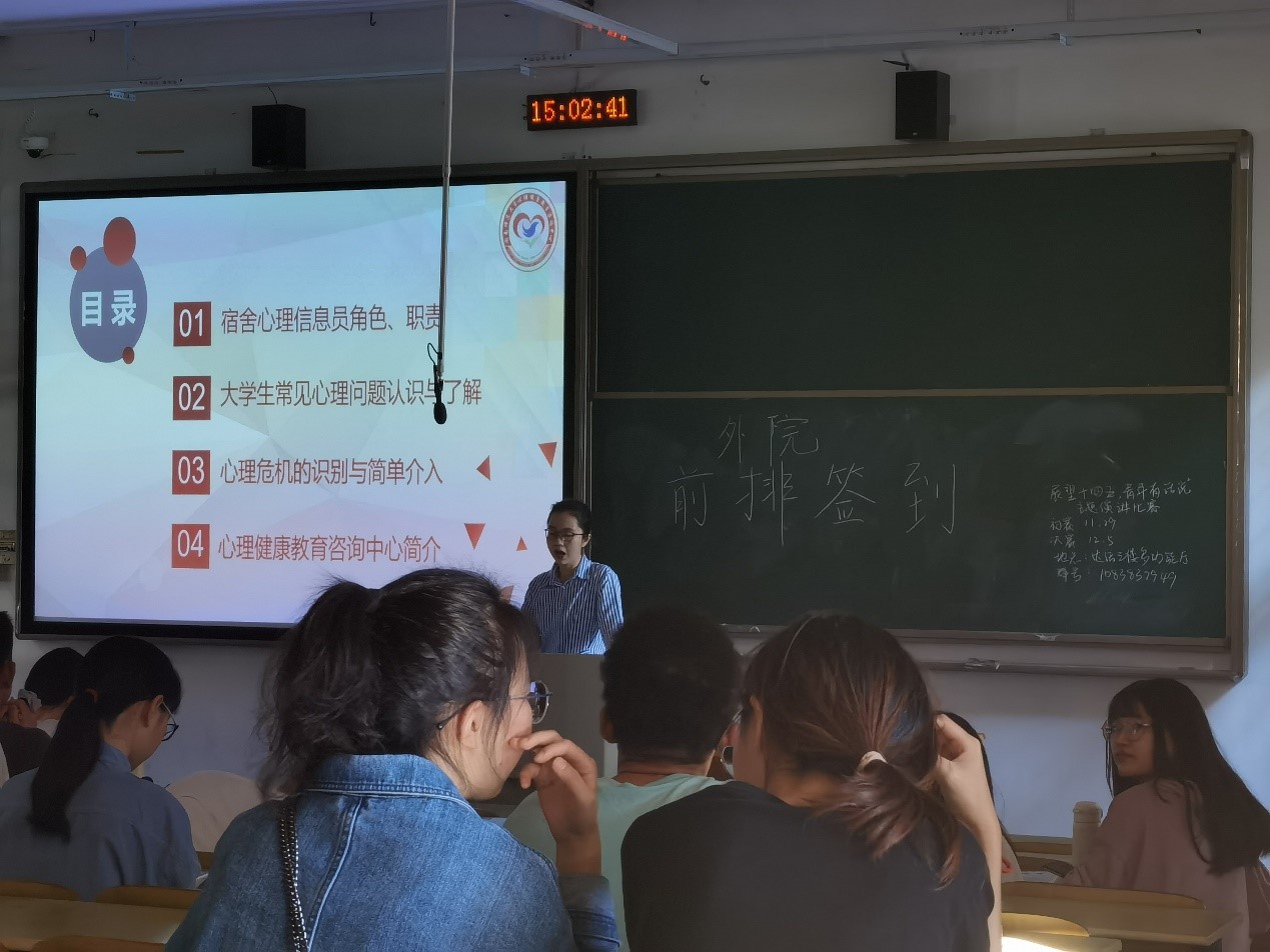 宿舍心理信息员培训在东大门梯二举行。参加此次心理培训的学生50 余人,培训由康其丰老师主持。