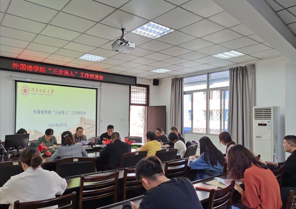 在综合楼中区506会议室召开“三全育人”工作推进会,学院领导班子成员、系主任、支部书记、科级干部、辅导员参加本次会议。会议由外院党委副书记朱兆军主持。
