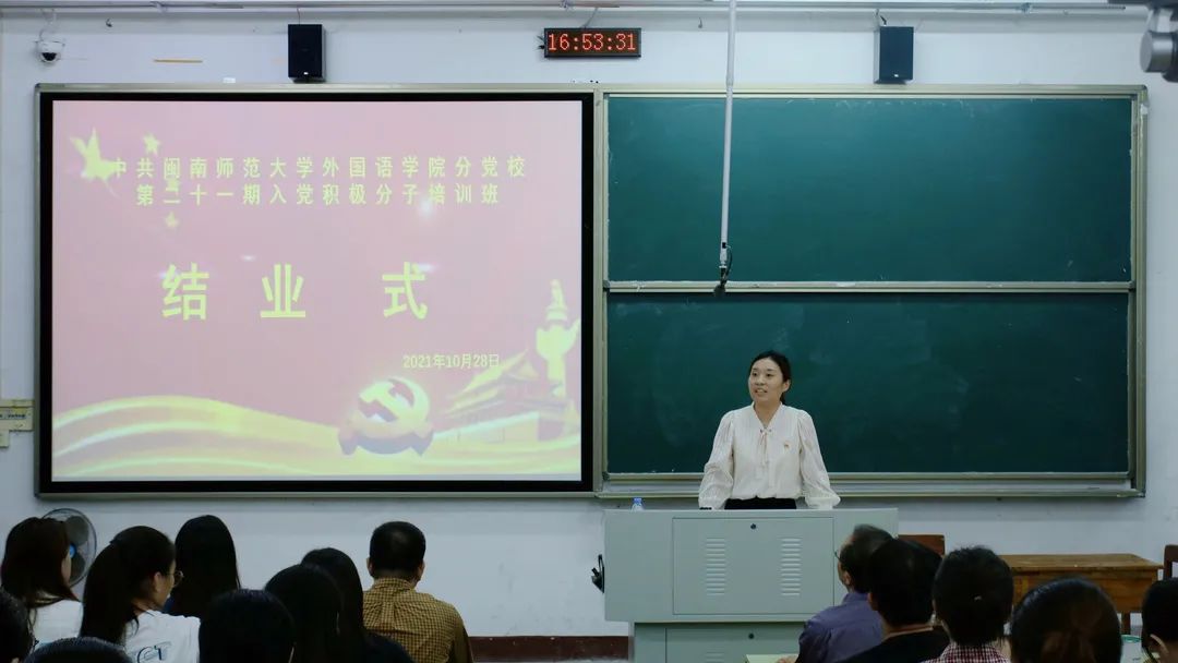 优秀学员代表林佳佳同学分享了本次培训班的心得。她对培训期间老师们的辛勤付出表达了感谢,并表示此次党校培训给大家提供了一个学习、进步的机会,也让大家深刻地认识到作为一名入党积极分子的责任与使命,并承诺,在今后的学习生活中,全体学员还会做到不断提高自己的理论素养、将锤炼党性与实践相结合、从党的百年历史中汲取智慧和力量,积极主动向党组织靠拢。