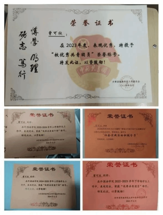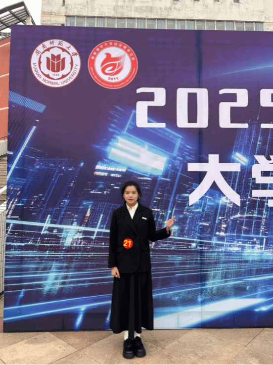 艺术团副团长、24级代理班主任。在思想上,她始终以党员的标准要求自己,不断提高自身党性修养。在学生工作上,她努力做好老师和同学沟通的桥梁,曾被评为校“优秀共青团干部”,院“优秀学生干部”。在学习上,她刻苦钻研,曾获得校专业二等奖学金,校“三好生标兵”等荣誉。她积极参加学科竞赛,获得2024年“国才杯”“理解当代中国”全国大学生外语能力演讲大赛校银奖,2024年“国才杯”“理解当代中国”短视频大赛校金奖、2024年全国大学生英语翻译大赛省金奖,第五届“英语讲故事大赛”校金奖,2024年21世纪演讲比赛省铜奖。此外,她还积极参加实践活动,在2024-2025学年寒假“追寻领袖足迹 体悟优秀传统文化”主题社会实践活动中获得“优秀个人”称号。