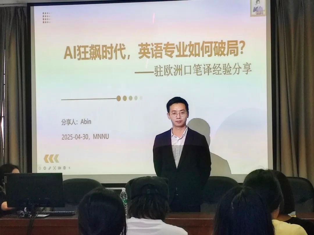 在 AI 技术飞速发展的浪潮中,英语专业的同学们是否感到迷茫与困惑?如何在这一时代背景下找到发展方向?4月30日,“青衿说”第三讲于综中504举办。此次讲座邀请到我院2018届翻译专业优秀校友刘江斌。他拥有驻德国、意大利、泰国等国家的口笔译实战经验,现世界500强央企任职。刘江斌校友带来的讲座以“AI 狂飙时代,英语专业如何破局?——驻欧洲口笔译经验分享”为主题,干货满满,为大家指引方向。我院MTI教育中心吴克炎教授与高永欣老师也莅临现场,与同学们一同聆听。