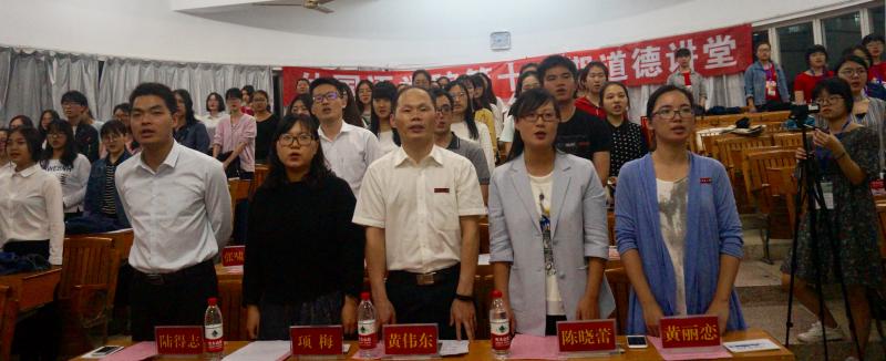 本次讲堂以爱国短片《林俊德:纵死终令汗竹香》拉开帷幕,在与心灵对话30秒中学员们对爱国有了更深的理解:作为一个中国人,时时刻刻热爱着自己的祖国。随后进行诗朗诵《祖国颂》和现场书法表演。全体齐唱《公民道德歌》以及情景剧表演《向尊敬中国人民脱帽》等节目让大家深刻体会即使相隔两岸,即使身处远方,中国依旧是中国人唯一的家。接着,李建民老师讲述了电视剧《人民的名义》中的一个细节,加深了大家对爱国的理解。随后黄伟东书记指出,爱国体现在每一个细节,希望以后能有更多人参加道德讲堂并对付出辛劳的老师和同学表示感谢。最后,主持人讲述了刘胡兰的故事,“生的伟大,死的光荣”是她一生的写照。榜样的力量提醒大家要更加坚定走中国特色社会主义现代化建设之路的信念,更加坚定为民族振兴,为人民造福的决心。全体人员向“德”鞠躬,此次活动在慷慨激昂的宣誓中接近尾声。