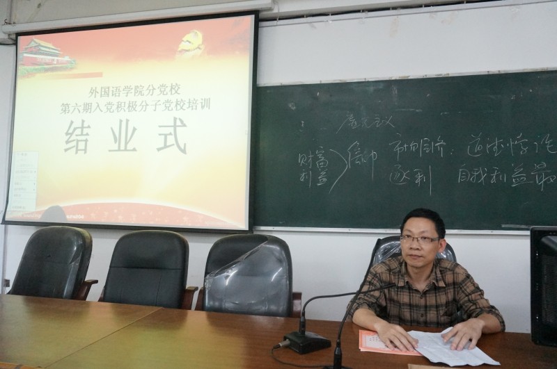 第六期入党积极分子培训结业式在逸梯二拉开帷幕,外院党总支副书记蓝邱勇老师以及外院的全体辅导员老师出席了此次结业式,外院团委副书记项梅老师担任此结业式主持人。