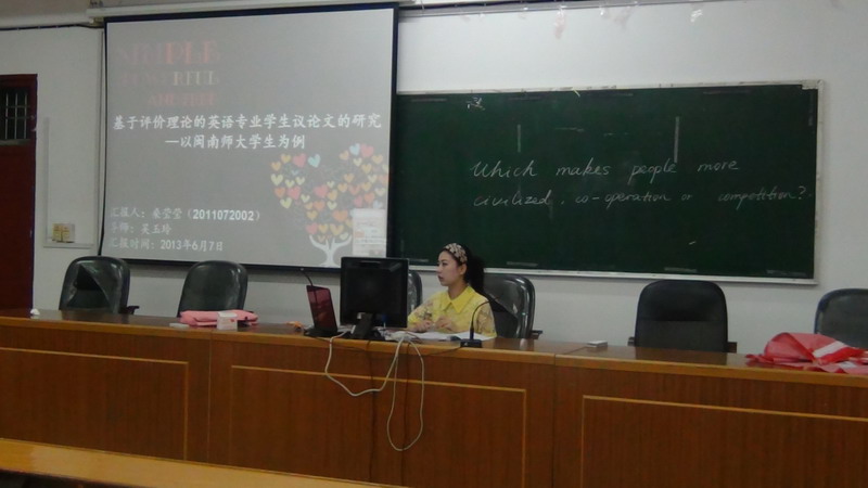英语专业大四103份作文来进行质性研究,其中包括:介入资源、情感词汇及非情感词汇的分析。该研究还提出几点教学启示和建议,如老师要教会学生围绕关键性的词汇写作;学生应进行词汇训练、句法训练、篇章训练等,同时,她还针对论文写作中可能遇到的问题给在场的同学们提供了许多值得借鉴的经验。