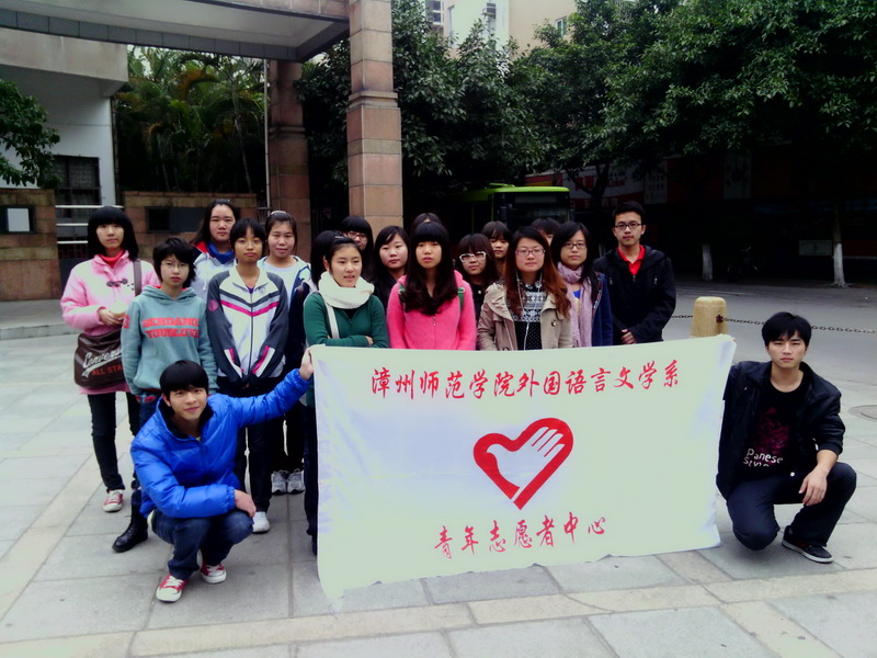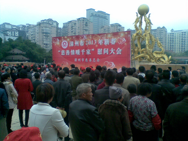 013年1月12日上午,漳州师范学院外语系青年志愿者中心20名志愿者来到九龙公园参加了漳州市2013年新春“慈善情暖千家”慰问大会志愿活动。