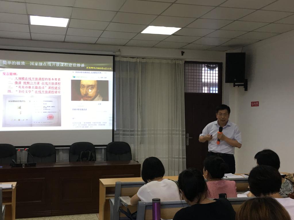 黄教授首先解读了国家级精品在线开放课程认定通知要点,接着以“英美诗歌名篇选读”(国家级精品视频公开课;教育部“爱课程-中国大学MOOC在线开放课程)、“圣经文学”(教育部“爱课程-中国大学MOOC在线开放课程)为例介绍了在线开放课程经历的三个阶段:微课、视频公开课与慕课,并总结了慕课建设需具备的基本要素:夯实的教学基本功、重视科研反哺教学、重视教学研究。会上师生积极提问,黄教授用深入浅出的语言给予解答,使师生们对慕课建设有了新的认识。