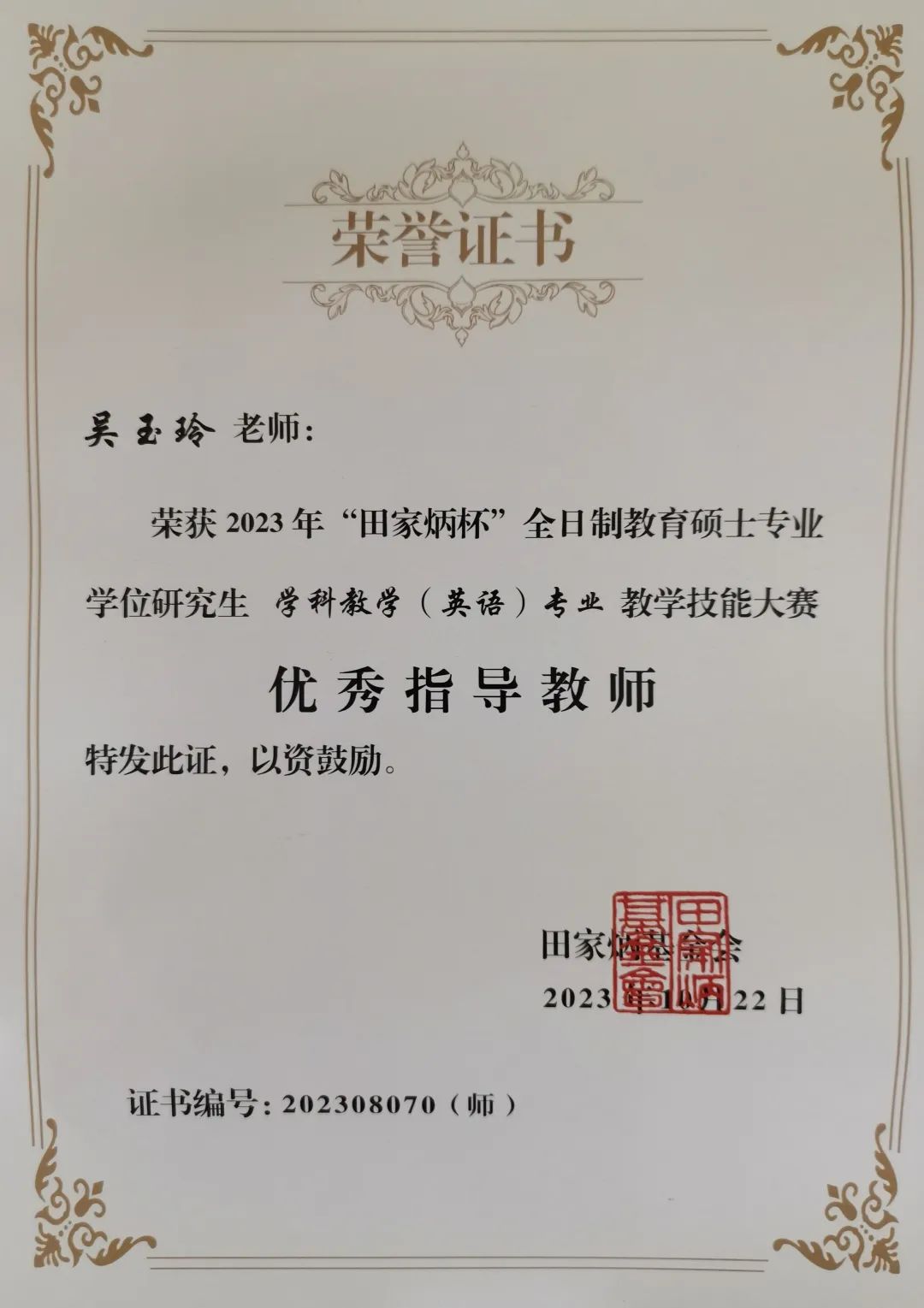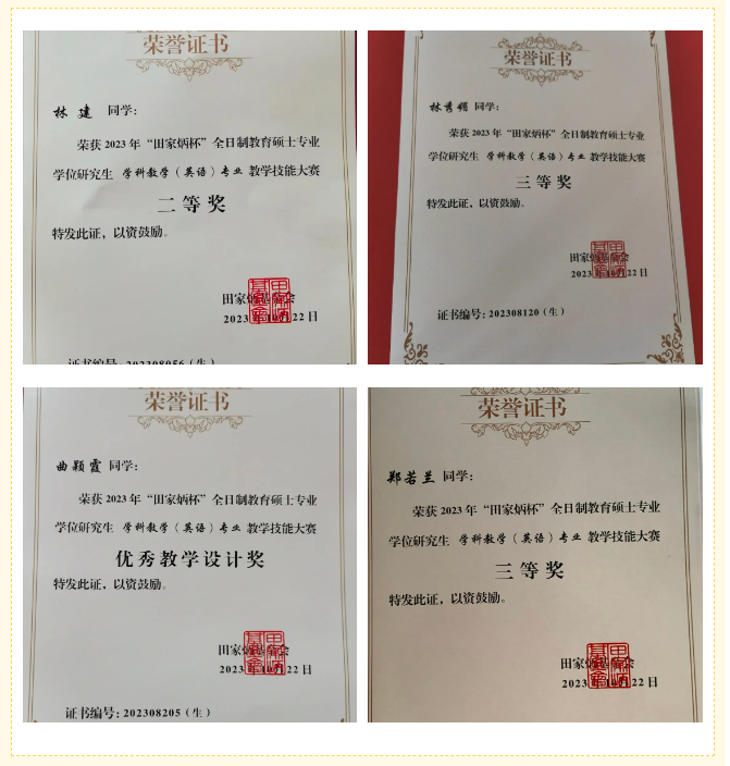 自竞赛启动以来,我院高度重视,周密安排,精心部署。经过老师的悉心指导,我院选手以端庄大方的教姿教态、富有感染力的语言和扎实的语言技能向大家展示了自己的教学风采,在比赛中脱颖而出。吴玉玲老师指导的研究生林建、郑若兰分别荣获全国二等奖和全国三等奖;陈彩虹老师指导的研究生林秀媚荣获全国三等奖,王羽青老师指导的研究生曲颖霞荣获优秀教学设计奖。吴玉玲老师荣获2023年全国“田家炳杯”全日制教育硕士专业学位研究生学科教学(英语)教学技能大赛优秀指导教师。