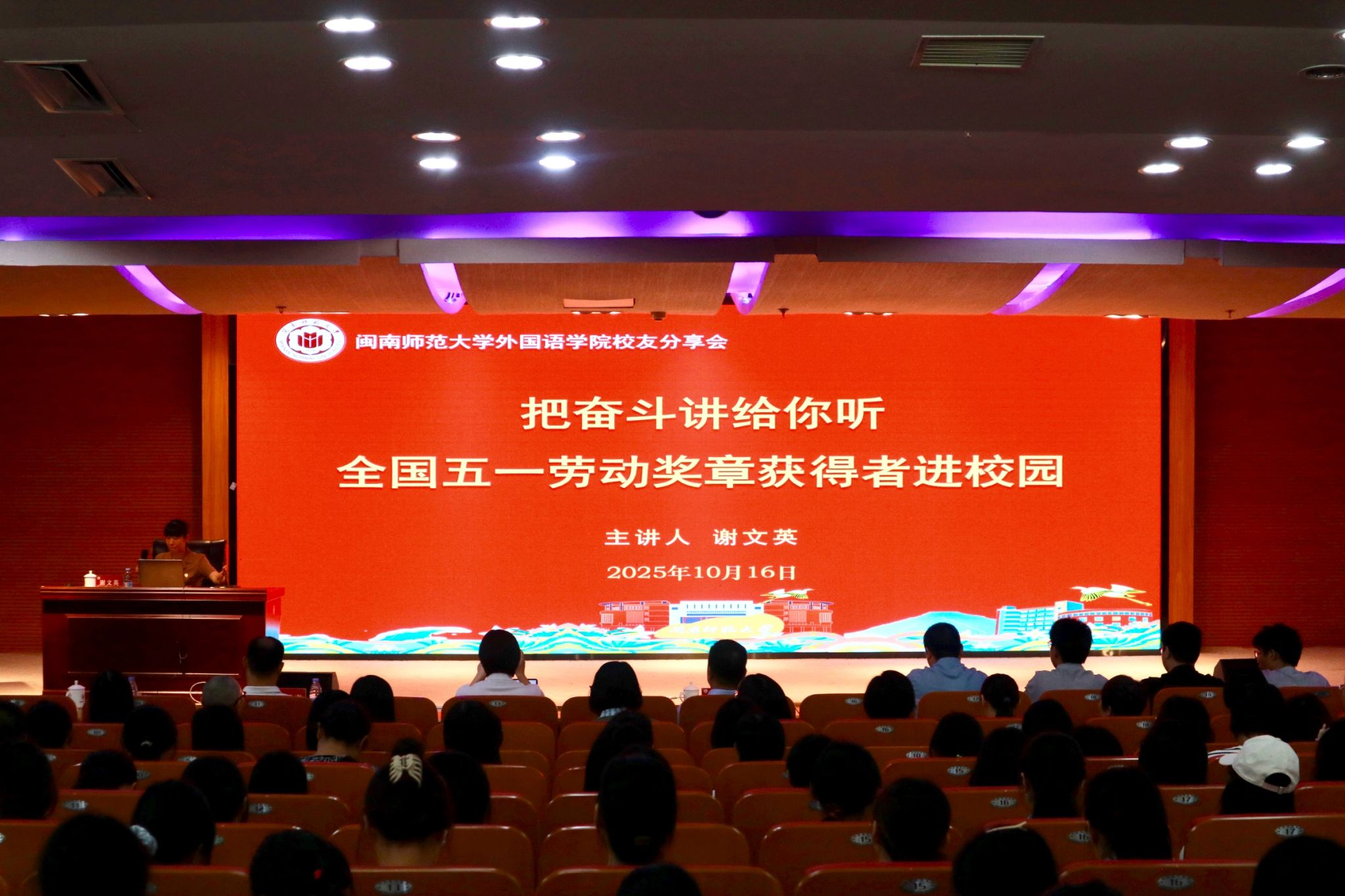 谢文英以习近平总书记弘扬劳模精神的重要讲话为引,结合自己数十年的教学实践,生动诠释了劳模精神的时代内涵,给在场师生上了一堂生动的思政大课。她分享了如何以创新思维革新高中英语课堂,坚守育人初心,并不断拓展教育的社会影响力。她深情表示,正是母校深厚的学风与老师的悉心培养,为她奠定了坚实的专业基础与人生信念,成为其教育路上砥砺前行的不竭动力。